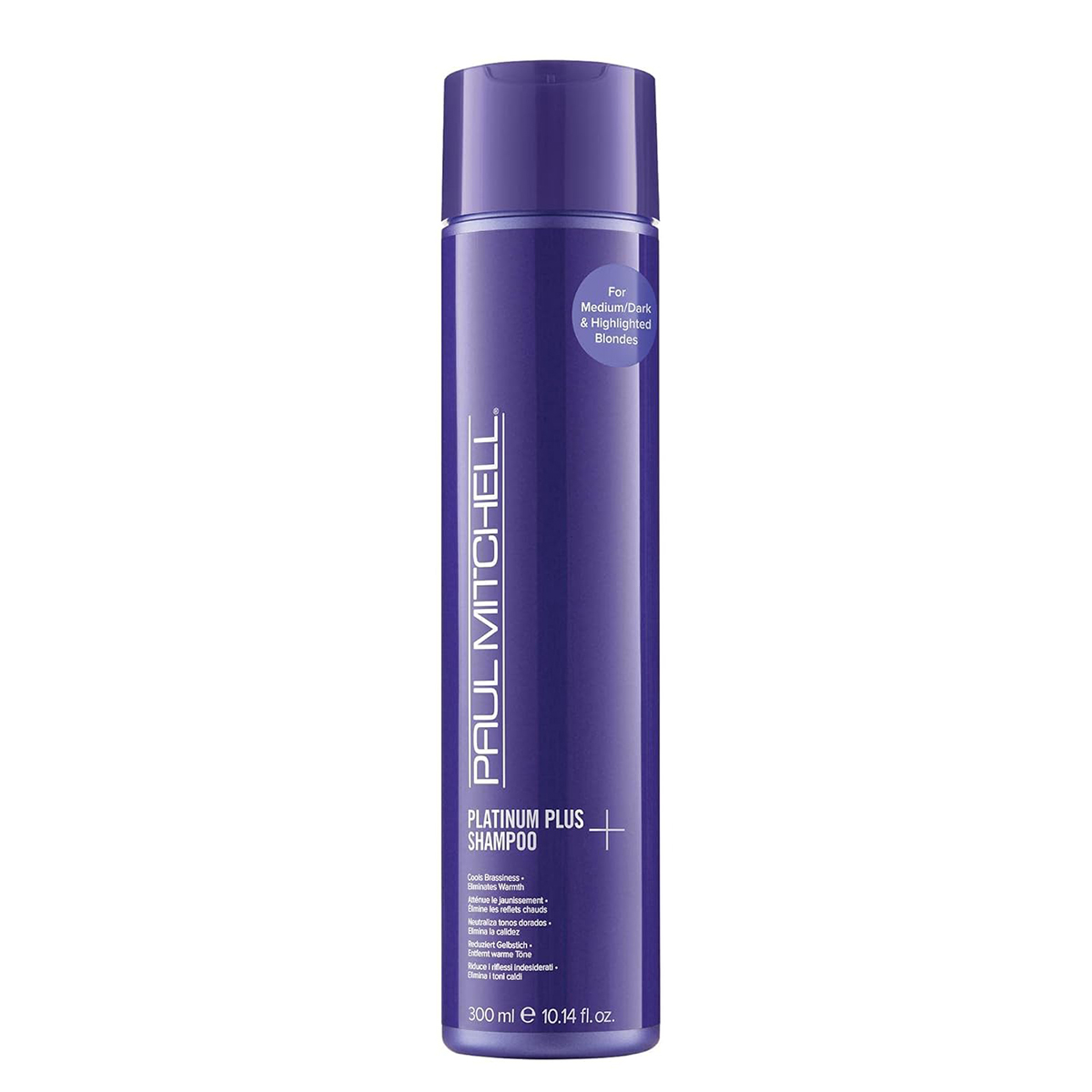 Highly pigmented Paul Mitchell Platinum Plus Purple Shampoo provides powerful weekly toning for medium to dark blondes or highlighted blondes.